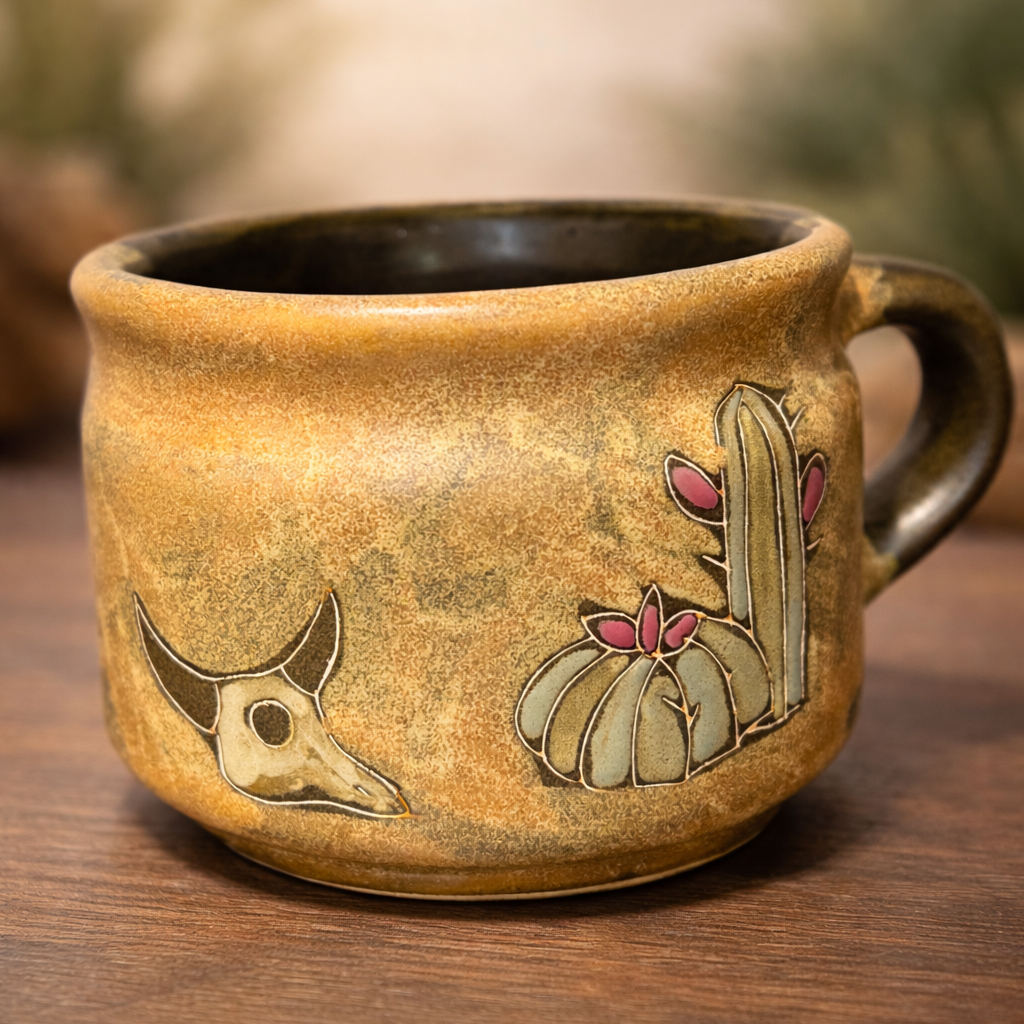 Beautiful handmade ceramic mug inspired by Southwest desert landscapes. Featuring cactus, skull, and desert flower designs, this rustic stoneware cup brings natural Western style to your daily coffee or tea.